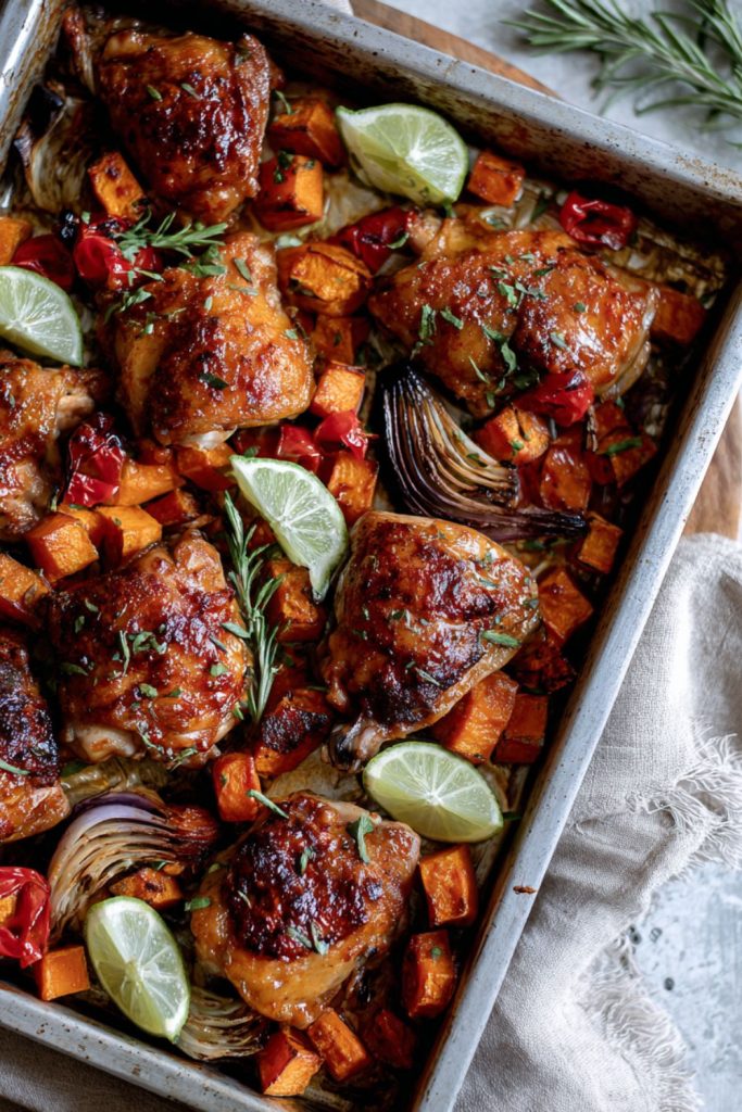 This spicy One-Pan Chicken with Apricot Harissa and Sweet Potatoes is made with skin-on chicken thighs, sweet potatoes, leeks, red peppers, and apricot harissa. This …