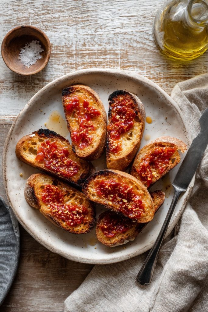 - Can I make the tomato topping ahead of time? Yes, you can prepare the grated tomato, garlic, and oil mixture a few hours in advance. Keep it covered in the refrigerator. Just be sure to bring it to room temperature before spreading it on the hot toast for the best flavor.